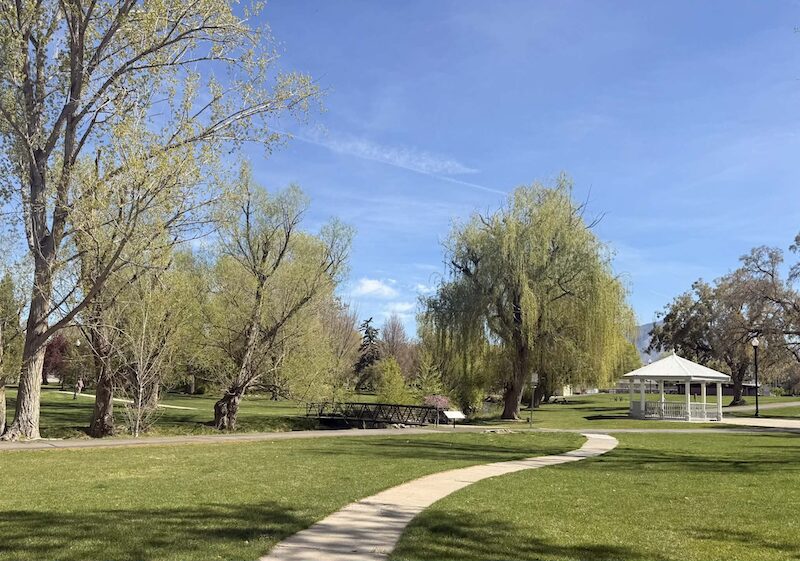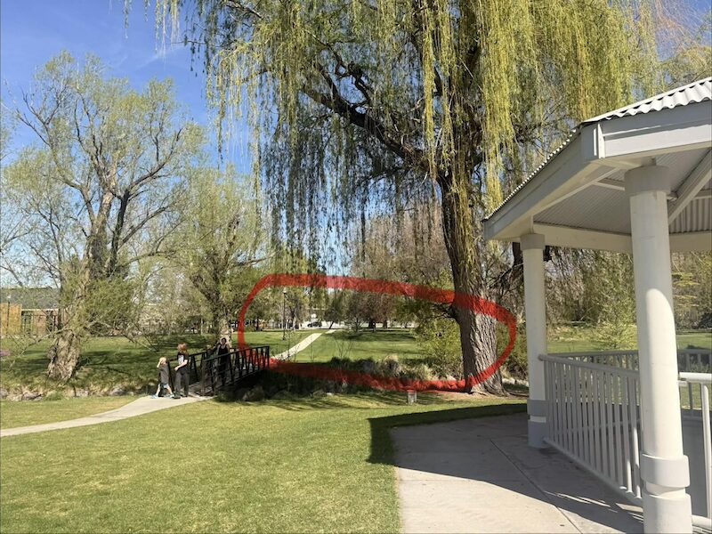 *白い東屋を目印に進み、小さな橋を渡った先の芝生に集合します